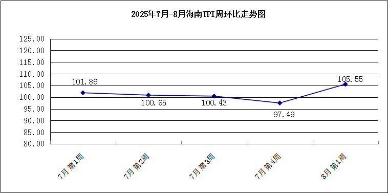 据海南省发展改革委监测数据显示,8月第1周(2025年7月28日-8月3日),中国·海南旅游消费价格指数(简称“海南TPI”)周环比上涨5.55%。