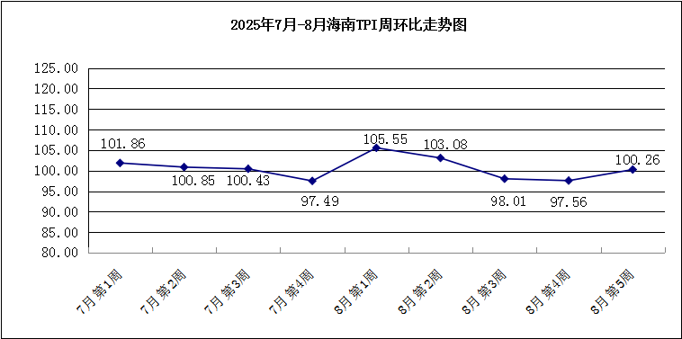 据海南省发展改革委监测数据显示,8月第5周(2025年8月25日-31日),中国·海南旅游消费价格指数(简称“海南TPI”)周环比上涨0.26%。