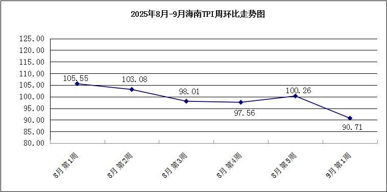 据海南省发展改革委监测数据显示,9月第1周(2025年9月1日-7日),中国·海南旅游消费价格指数(简称“海南TPI”)周环比下降9.29%。