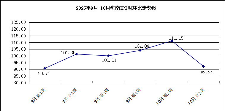 据海南省发展改革委监测数据显示,10月第2周(2025年10月6日-12日),中国·海南旅游消费价格指数(简称“海南TPI”)周环比下降7.79%。