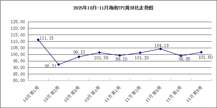 据海南省发展改革委监测数据显示,11月第5周(2025年11月24日-30日),中国·海南旅游消费价格指数(简称“海南TPI”)周环比上涨1.60%。