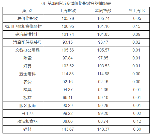 据临沂商城指数信息系统监测,本周临沂商城周价格总指数为105.74点,环比下跌0.05点。