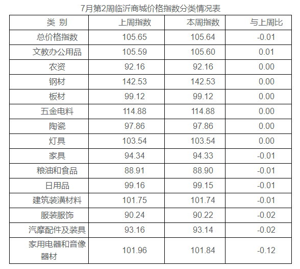 据临沂商城指数信息系统监测,本周临沂商城周价格总指数为105.62点,环比下跌0.02点。