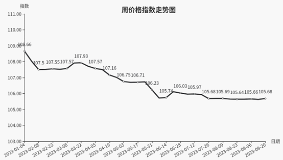 据临沂商城价格指数信息系统监测,本周临沂商城周价格总指数为105.68点,环比上涨0.05点,涨幅0.05%。
