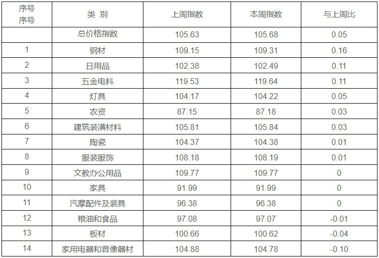 在14类商品价格指数中,上涨的8类、持平的3类、下跌的3类。其中,涨幅前3位的是:钢材类、日用品类、五金电料类,分别上涨0.16、0.11、0.11点;下跌的3类的是:家用电器和音像器材类、板材类、粮油和食品类,分别下跌0.10、0.04、0.01点;灯具类、农资类、建筑装潢材料类、陶瓷类、服装服饰类、文教办公用品类、家具类、汽摩配件及装具类等8大类价格指数波动较小或持平。