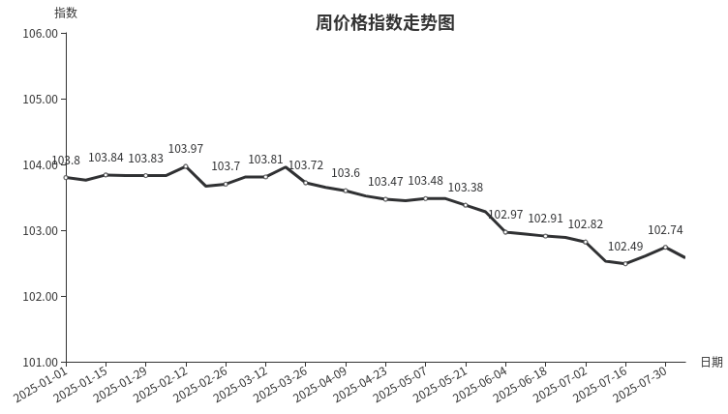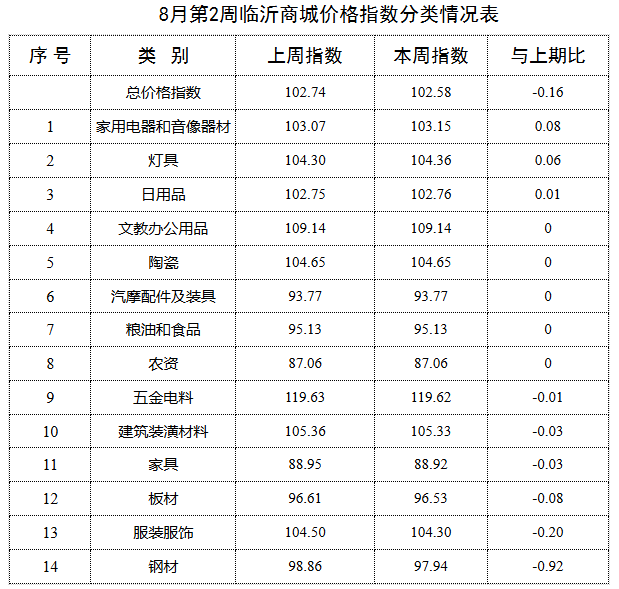 据临沂商城价格指数信息系统监测,本周临沂商城周价格总指数为102.58点,环比下跌0.16点,跌幅0.16%。