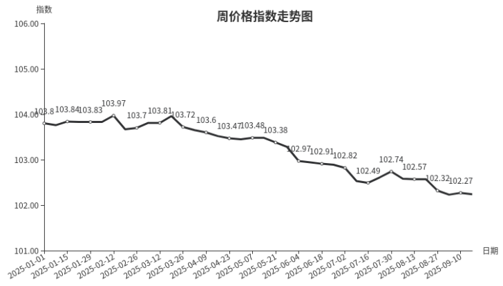 据临沂商城价格指数信息系统监测,本周临沂商城周价格总指数为102.24点,环比下跌0.03点,跌幅0.03%。