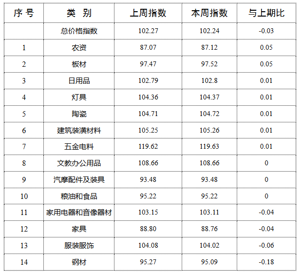 在14类商品价格指数中,上涨的7类、持平的3类、下跌的4类。其中,上涨前3位的是:农资类、板材类、日用品类,分别上涨0.05、0.05、0.01点;下跌前3位的是:钢材类、服装服饰类、家具类,分别下跌0.18、0.06、0.04点;灯具类、陶瓷类、建筑装潢材料类、五金电料类、文教办公用品类、汽摩配件及装具类、粮油和食品类、家用电器和音像器材类等8大类价格指数波动较小或持平。