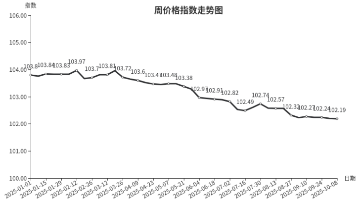据临沂商城价格指数信息系统监测,本周临沂商城周价格总指数为102.19点,环比下跌0.01点,跌幅0.01%。