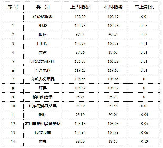 在14类商品价格指数中,上涨的6类、持平的3类、下跌的5类。其中,上涨前3位的是:陶瓷类、板材类、日用品类,分别上涨0.05、0.02、0.01点;下跌前3位的是:家具类、服装服饰类、家用电器和音像器材类,分别下跌0.13、0.06、0.05点;农资类、建筑装潢材料类、五金电料类、文教办公用品类、灯具类、粮油和食品类、汽摩配件及装具类、钢材类等8大类价格指数波动较小或持平。