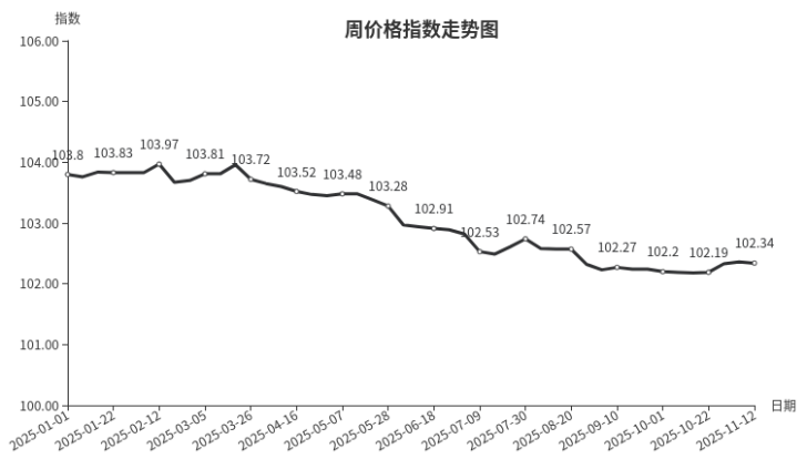 据临沂商城价格指数信息系统监测,本周临沂商城周价格总指数为102.34点,环比下跌0.02点,跌幅0.02%。