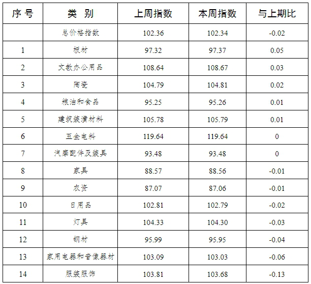 在14类商品价格指数中,上涨的5类、持平的2类、下跌的7类。其中,上涨前3位的是:板材类、文教办公用品类、陶瓷类,分别上涨0.05、0.03、0.02点;下跌前3位的是:服装服饰类、家用电器和音像器材类、钢材类,分别下跌0.13、0.06、0.04点;粮油和食品类、建筑装潢材料类、五金电料类、汽摩配件及装具类、家具类、农资类、日用品类、灯具类等8大类价格指数波动较小或持平。