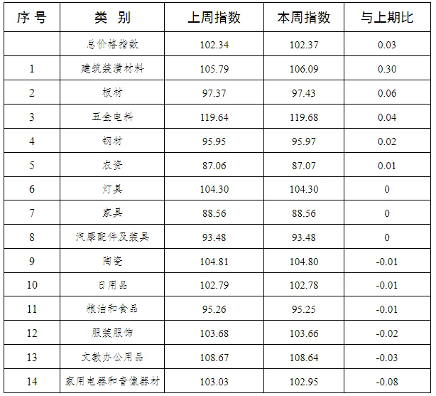 在14类商品价格指数中,上涨的5类、持平的3类、下跌的6类。其中,上涨前3位的是:建筑装潢材料类、板材类、五金电料类,分别上涨0.30、0.06、0.04点;下跌前3位的是:家用电器和音像器材类、文教办公用品类、服装服饰类,分别下跌0.08、0.03、0.02点;钢材类、农资类、灯具类、家具类、汽摩配件及装具类、陶瓷类、日用品类、粮油和食品类等8大类价格指数波动较小或持平。