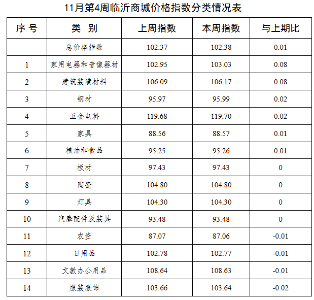 据临沂商城价格指数信息系统监测,本周临沂商城周价格总指数为102.38点,环比上涨0.01点,涨幅0.01%。
