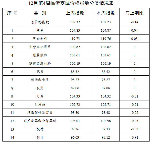 在14类商品价格指数中,上涨的2类、持平的6类、下跌的6类。其中,上涨的2类是:陶瓷类、五金电料类,分别上涨0.04、0.03点;下跌前3位的是:钢材类、板材类、家用电器和音像器材类,分别下跌0.91、0.03、0.03点;文教办公用品类、服装服饰类、建筑装潢材料类、家具类、粮油和食品类、农资类、灯具类、日用品类、汽摩配件及装具类等9大类价格指数波动较小或持平。