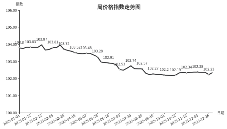 据临沂商城价格指数信息系统监测,本周临沂商城周价格总指数为102.35点,环比上涨0.12点,涨幅0.12%。