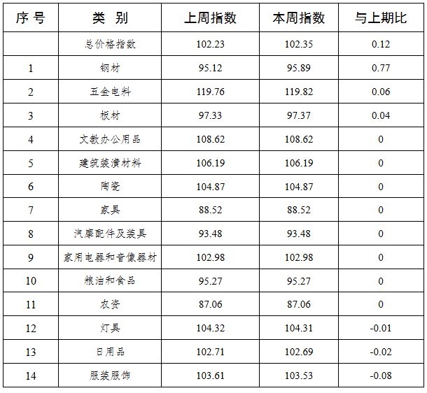 在14类商品价格指数中,上涨的3类、持平的8类、下跌的3类。其中,上涨前3位的是:钢材类、五金电料类、板材类,分别上涨0.77、0.06、0.04点;下跌前3位的是:服装服饰类、日用品类、灯具类,分别下跌0.08、0.02、0.01点;文教办公用品类、建筑装潢材料类、陶瓷类、家具类、汽摩配件及装具类、家用电器和音像器材类、粮油和食品类、农资类等8大类价格指数波动较小或持平。