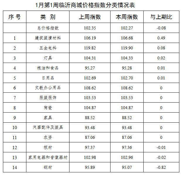 在14类商品价格指数中,上涨的5类、持平的6类、下跌的3类。其中,上涨前3位的是:建筑装潢材料类、五金电料类、灯具类,分别上涨0.49、0.08、0.02点;下跌的3类是:钢材类、家用电器和音像器材类、板材类,分别下跌0.82、0.02、0.01点;粮油和食品类、日用品类、文教办公用品类、服装服饰类、陶瓷类、家具类、汽摩配件及装具类、农资类等8大类价格指数波动较小或持平。