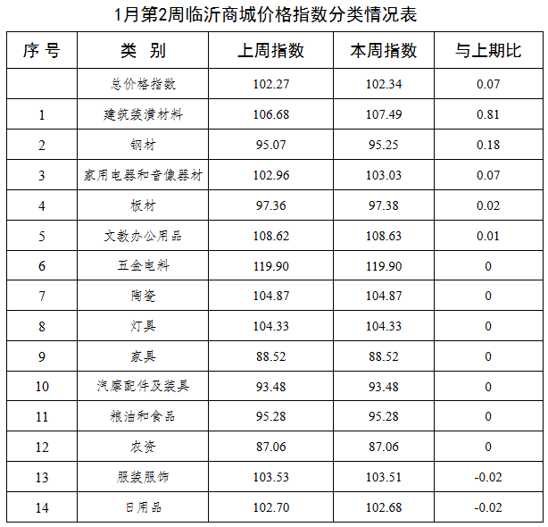 据临沂商城价格指数信息系统监测,本周临沂商城周价格总指数为102.34点,环比上涨0.07点,涨幅0.07%。
