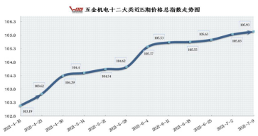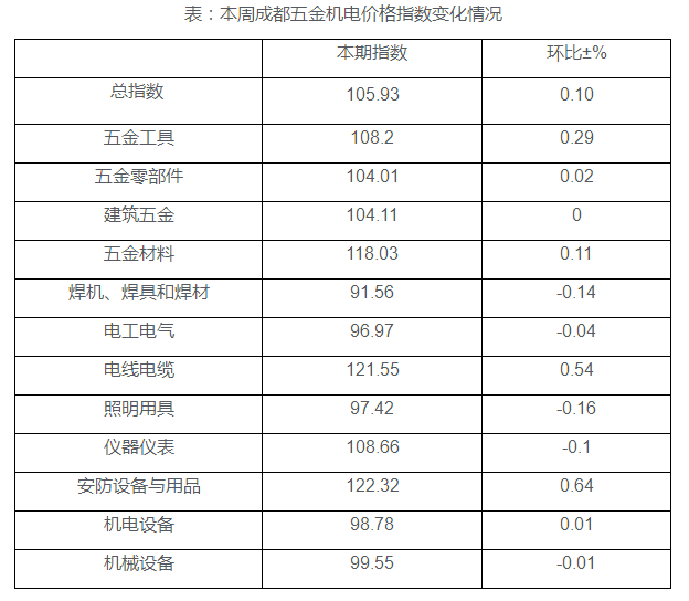 本期(2021/07/09)“中国成都五金机电指数”(以下简称“五金机电指数”)价格总指数收于105.93点与上期相比上涨0.10个百分点,与去年同期100.45相比上涨5.48个百分点。