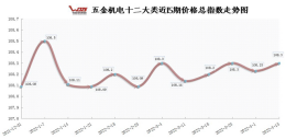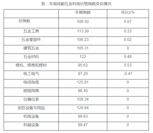 组成“中国成都五金机电价格总指数”的12大类价格指数呈现“4涨1跌7平”的态势。本期上涨指数前三位分别是:【焊机、焊具和焊材】类本期指数95.63,上涨0.53个百分点,【五金材料】类本期指数122点,上涨0.48个百分点,【五金工具】类本期指数113.39点,上涨0.22点;本期下跌指数仅一类产品,为【电工电气】类,本期指数97.20点,下跌0.41个百分点。