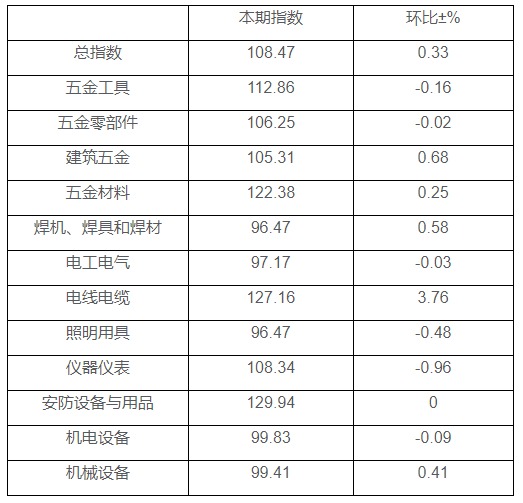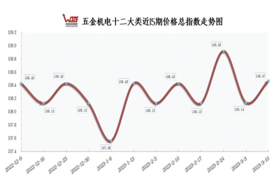 本期(2023/03/10)“中国成都五金机电指数”(以下简称“五金机电指数”)价格总指数收于108.47点与上期相比上涨0.33个百分点,与去年同期108.14相比上涨0.33个百分点。