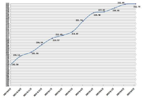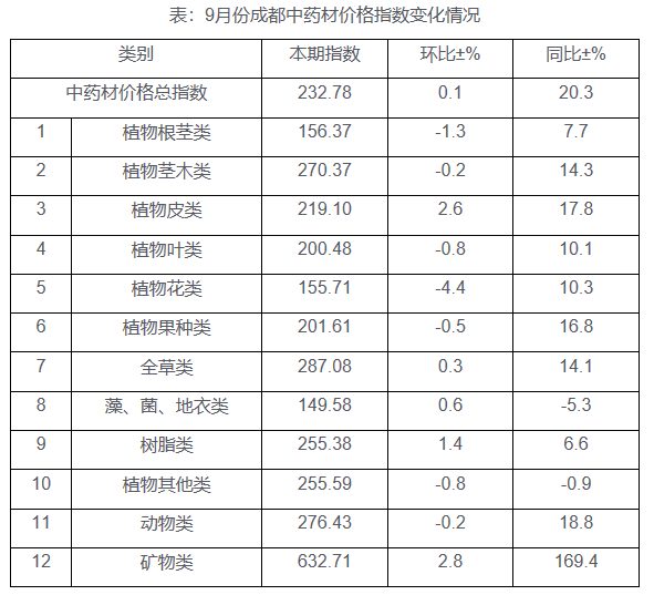 据对成都中药材市场价格监测显示,2022年9月份成都中药材价格指数为232.78点(以2010年8-9月份平均价格为基期),环比上涨0.1%,同比上涨20.3%。组成价格指数的12类分类指数呈现“5涨7跌”的态势。其中,植物皮类、全草类、藻菌地衣类、树脂类、矿物类药材价格指数分别为219.10点、287.08点、149.58点、255.38点、632.71点,与2022年8月相比分别上涨2.6%、0.3%、0.6%、1.4%、2.8%;植物根茎类、植物茎木类、植物叶类、植物花类、植物果种类、植物其他类、动物类药材价格指数分别为156.37点、270.37点、200.48点、155.71点、201.61点、255.59点、276.43点,与2022年7月相比分别下跌1.3%、0.2%、0.8%、4.4%、0.5%、0.8%、0.2%。