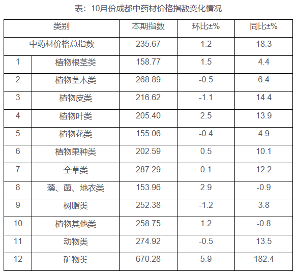 据对成都中药材市场价格监测显示,2022年10月份成都中药材价格指数为235.67点(以2010年8-9月份平均价格为基期),环比上涨0.1%,同比上涨18.3%。组成价格指数的12类分类指数呈现“7涨5跌”的态势。其中,植物根茎类、植物叶类、植物果种类、全草类、藻菌地衣类、植物其他类、矿物类药材价格指数分别为158.77点、205.40点、202.59点、287.29点、153.96点、258.75点、670.28点,与2022年9月相比分别上涨1.5%、2.5%、0.5%、0.1%、2.9%、1.2%、5.9%;植物茎木类、植物皮类、植物花类、树脂类、动物类药材价格指数分别为268.89点、216.62点、155.06点、252.38点、274.92点,与2022年9月相比分别下跌0.5%、1.1%、0.4%、1.2%、0.5%。