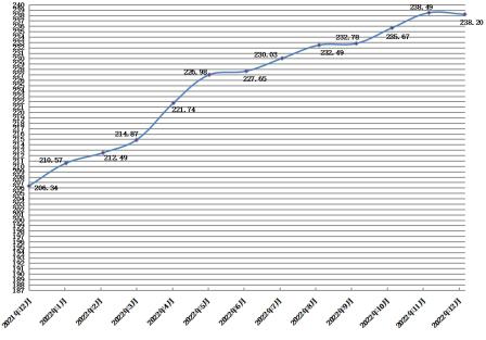 本月价格指数与上月相比小幅下跌,行情总体较为震荡,月价格指数从238.49点跌到238.20点,跌幅为0.1%。本月中药材市场受到疫情放开感染人数较多影响,疫情题材相关中药材需求波动明显,其他类别中药材需求减弱,加之卖方人员阳性后供给受到影响,价格保持小幅下跌态势;从外部因素看,经济发展形势不如往期,总体边际需求缩减;这些因素都造成了本月价格的下跌。