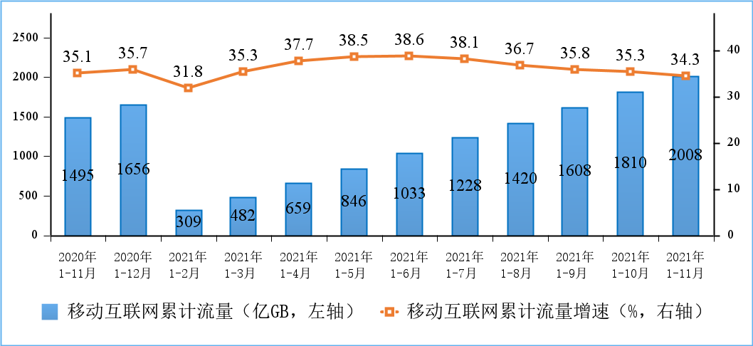 图1 2020-2021年1-11月份移动互联网累计接入流量及增速情况