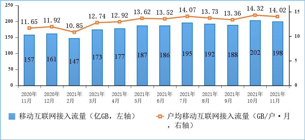 2021年前11月,移动互联网累计流量达2008亿GB,同比增长34.3%。其中,通过手机上网的流量达到1923亿GB,同比增长35.8%,占移动互联网总流量的95.8%。11月份当月户均移动互联网接入流量(DOU)达到14.02GB/户·月,同比增长20.4%,比上年底高2.1GB/户·月。