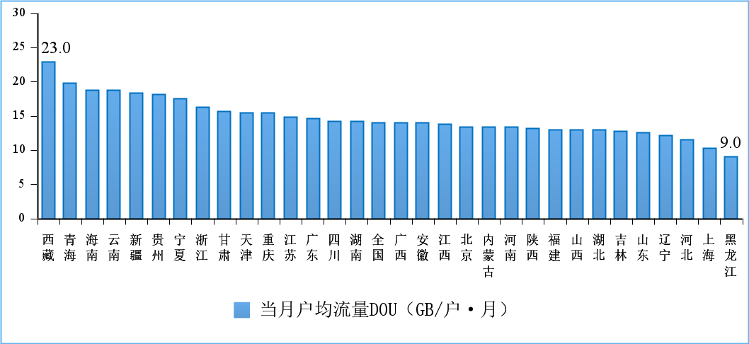 2021年前11月,东、中、西部和东北地区移动互联网接入流量分别达到858亿GB、447亿GB、593亿GB和109亿GB,同比增长36%、38%、30.2%和30.2%。西藏和青海11月份当月户均移动互联网接入流量(DOU)超过19GB/户·月;各省DOU值最高值与最低值之差为14GB/户每月,差值较去年同期扩大3GB/户·月。
