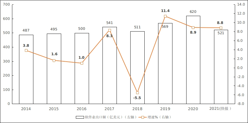 2021年,软件业务出口521亿美元,同比增长8.8%,两年复合增长率为3.0%。其中,软件外包服务出口149亿美元,同比增长8.6%;嵌入式系统软件出口194亿美元,同比增长4.9%。