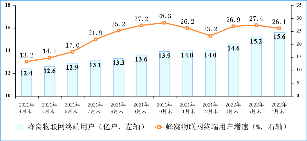 截至2022年4月末,移动、联通、电信三家基础电信企业发展蜂窝物联网终端用户15.6亿户,比上年末净增1.59亿户。