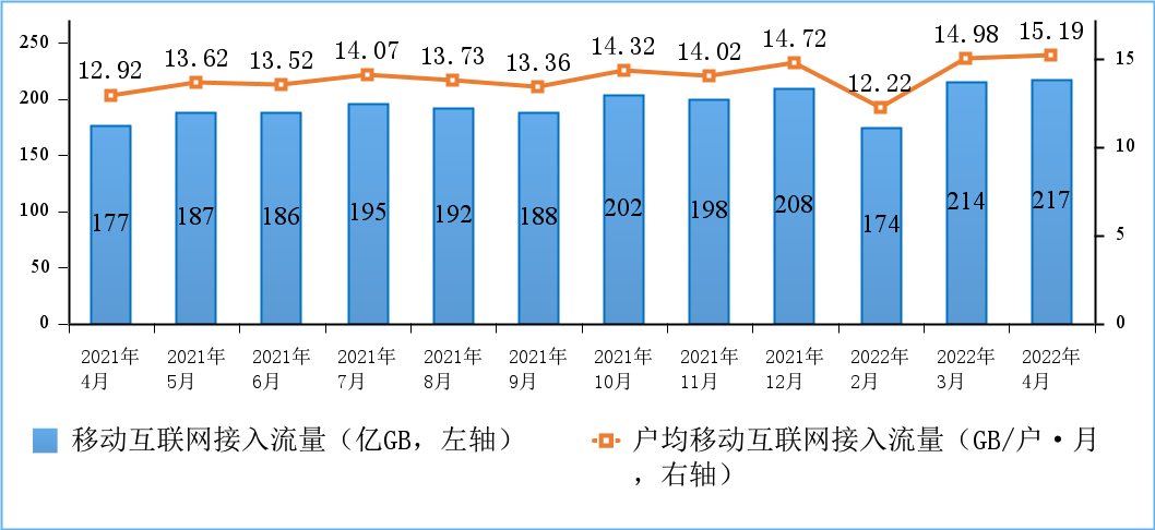 移动互联网流量较快增长,4月DOU值超15GB/户。1-4月份,移动互联网累计流量达804.4亿GB,同比增长22.1%。截至4月末,移动互联网用户数达14.2亿户,比上年末净增641.8万户。4月当月户均移动互联网接入流量(DOU)达到15.19GB/户每月,同比增长17.6%,比上年底高0.47GB/户每月。