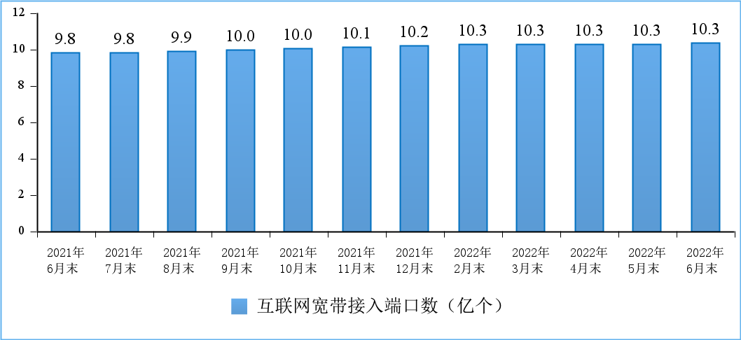 上半年,我国新建5G基站42.9万个,总数达到185.4万个,占移动基站总数的17.9%,占比较上年末提高3.6个百分点。全国互联网宽带接入端口数量达10.3亿个,比上年末净增1685万个;其中,光纤接入(FTTH/O)端口达到9.85亿个,比上年末净增2517万个,占比由上年末的94.3%提升到95.2%。具备千兆网络服务能力的10G PON端口数达1103万个,比上年末净增318万个。