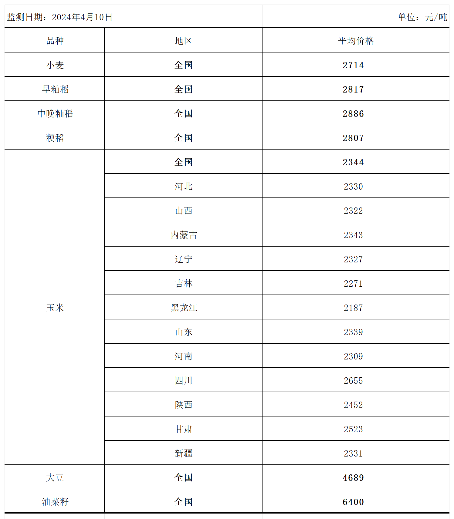 全国主要粮食品种收购价格周报(4月10日)