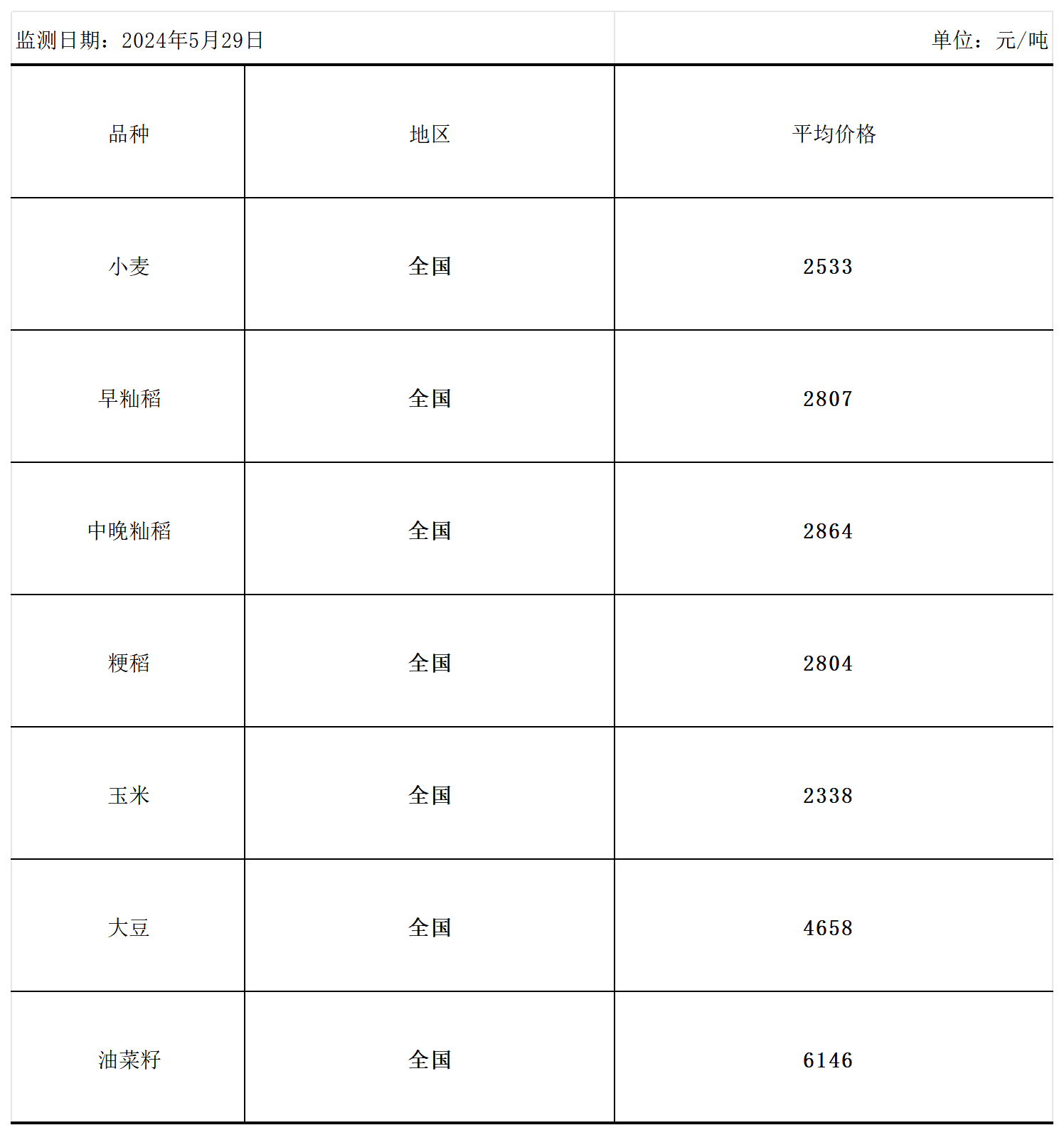 全国主要粮食品种收购价格周报(5月29日)