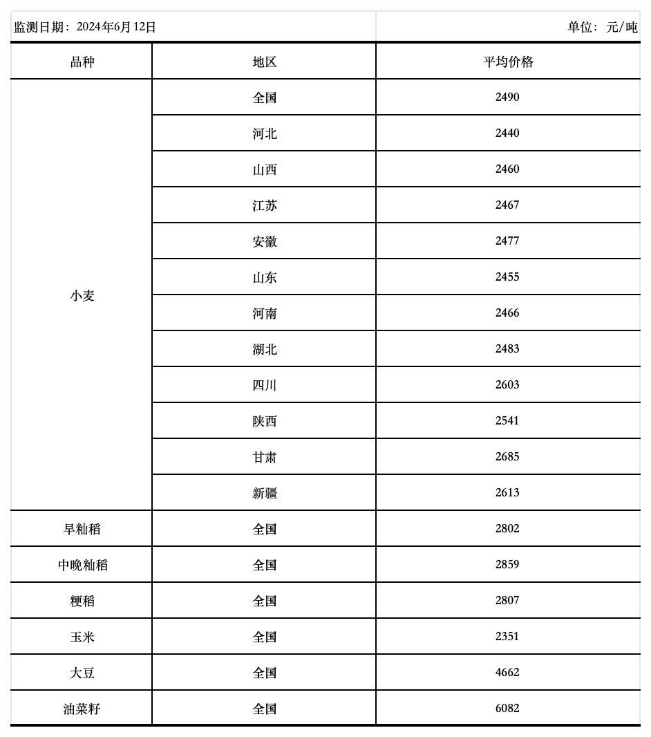 全国主要粮食品种收购价格周报(6月12日)