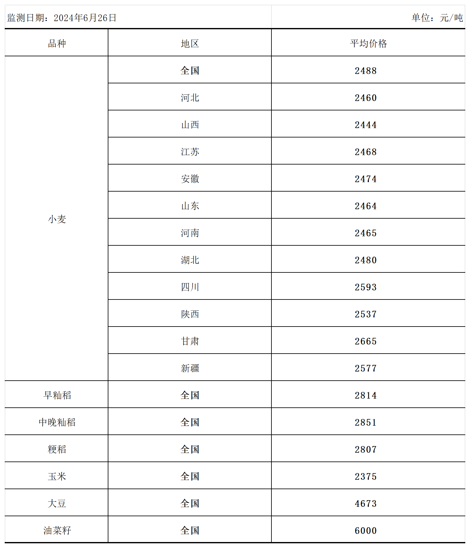 全国主要粮食品种收购价格周报(6月26日)