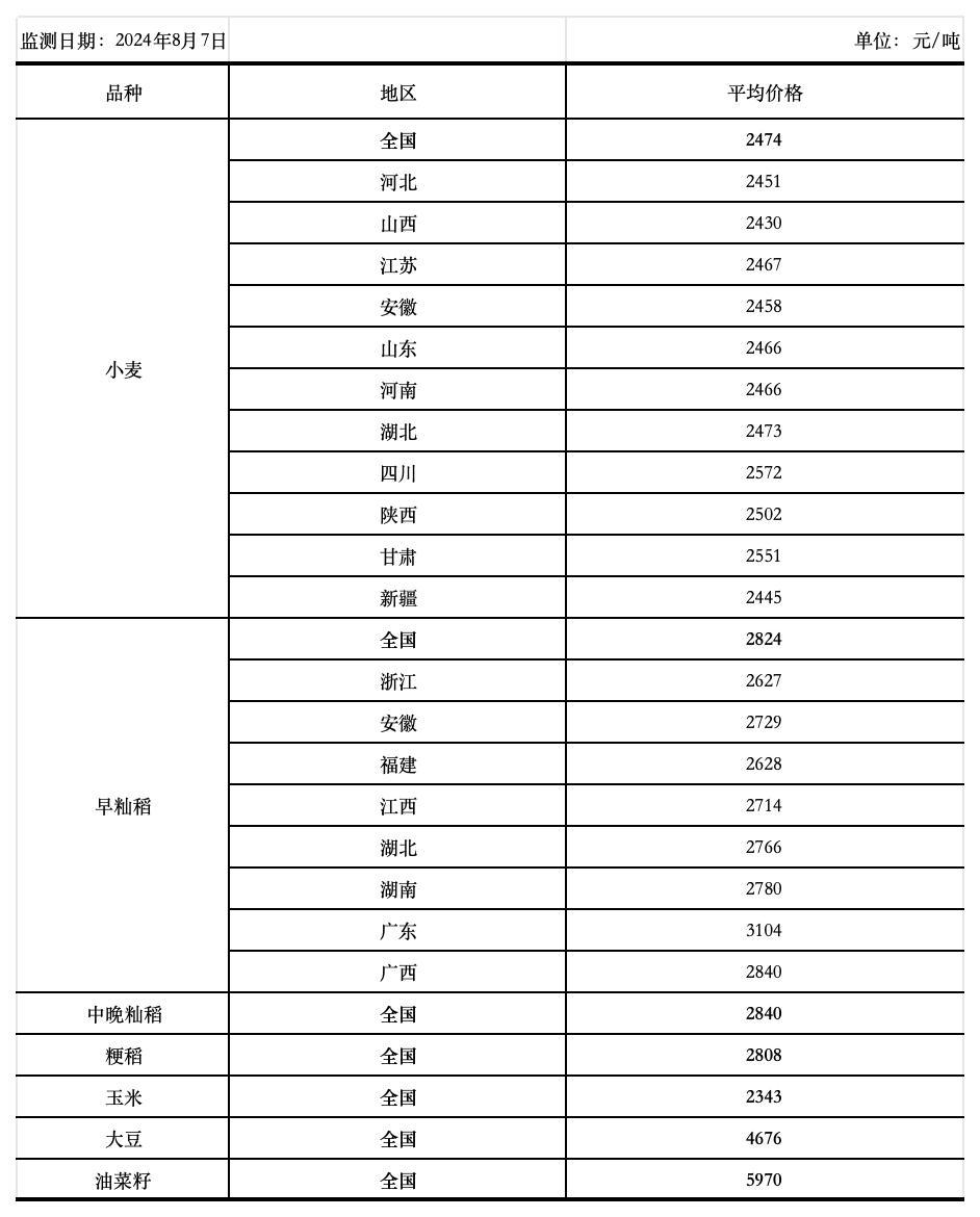 全国主要粮食品种收购价格周报(8月7日)