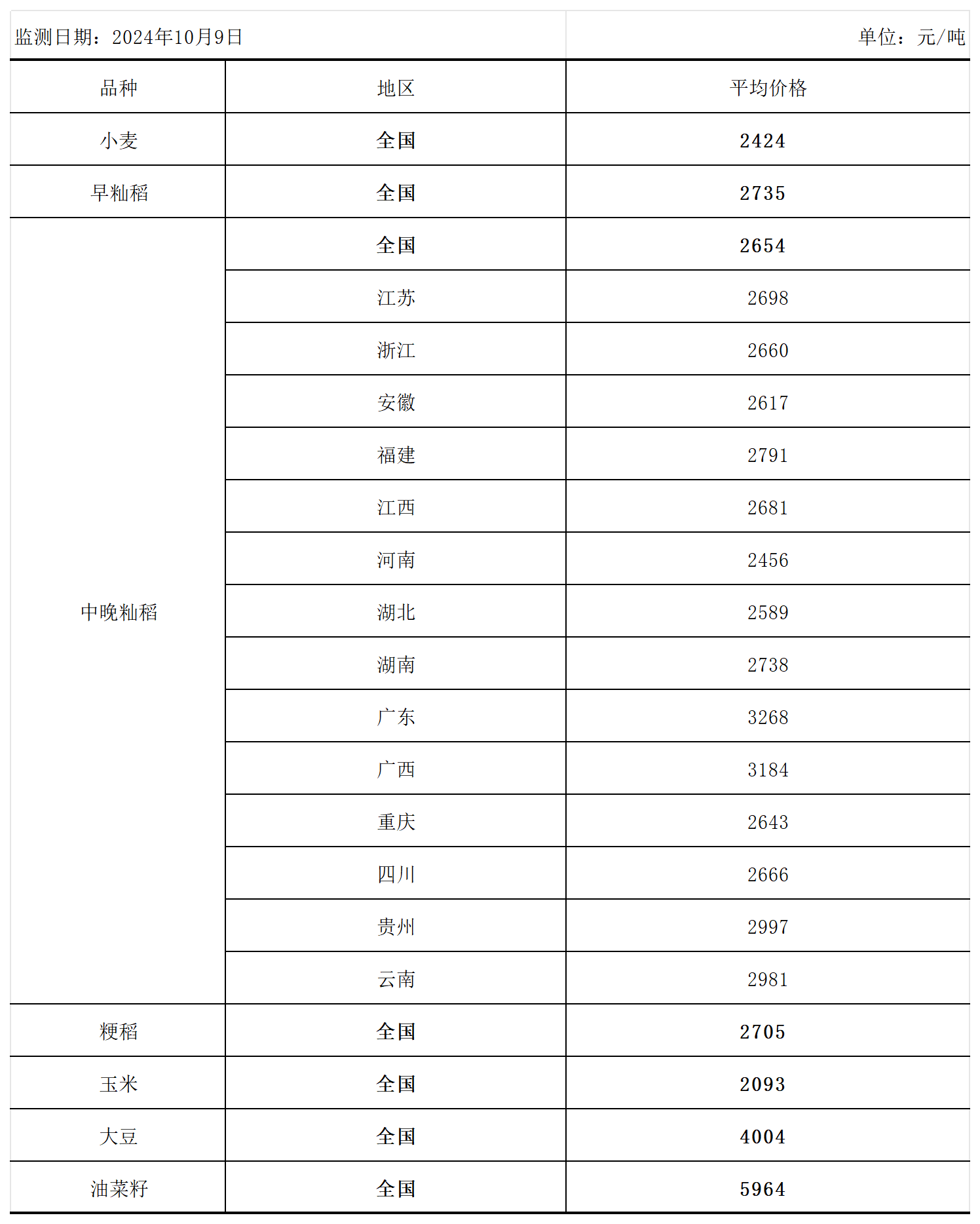 全国主要粮食品种收购价格周报(10月9日)