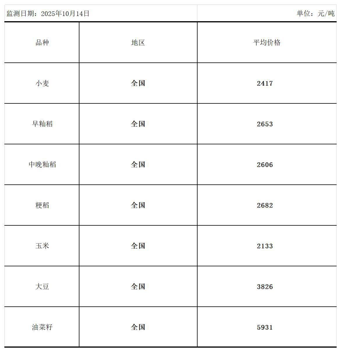 全国主要粮食品种收购价格周报(10月14日)