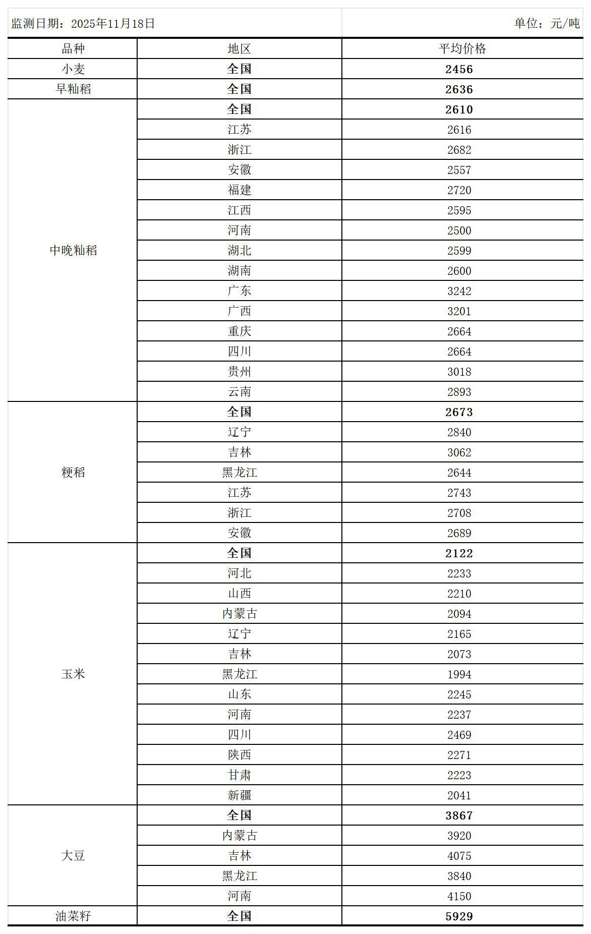 全国主要粮食品种收购价格周报(11月18日)