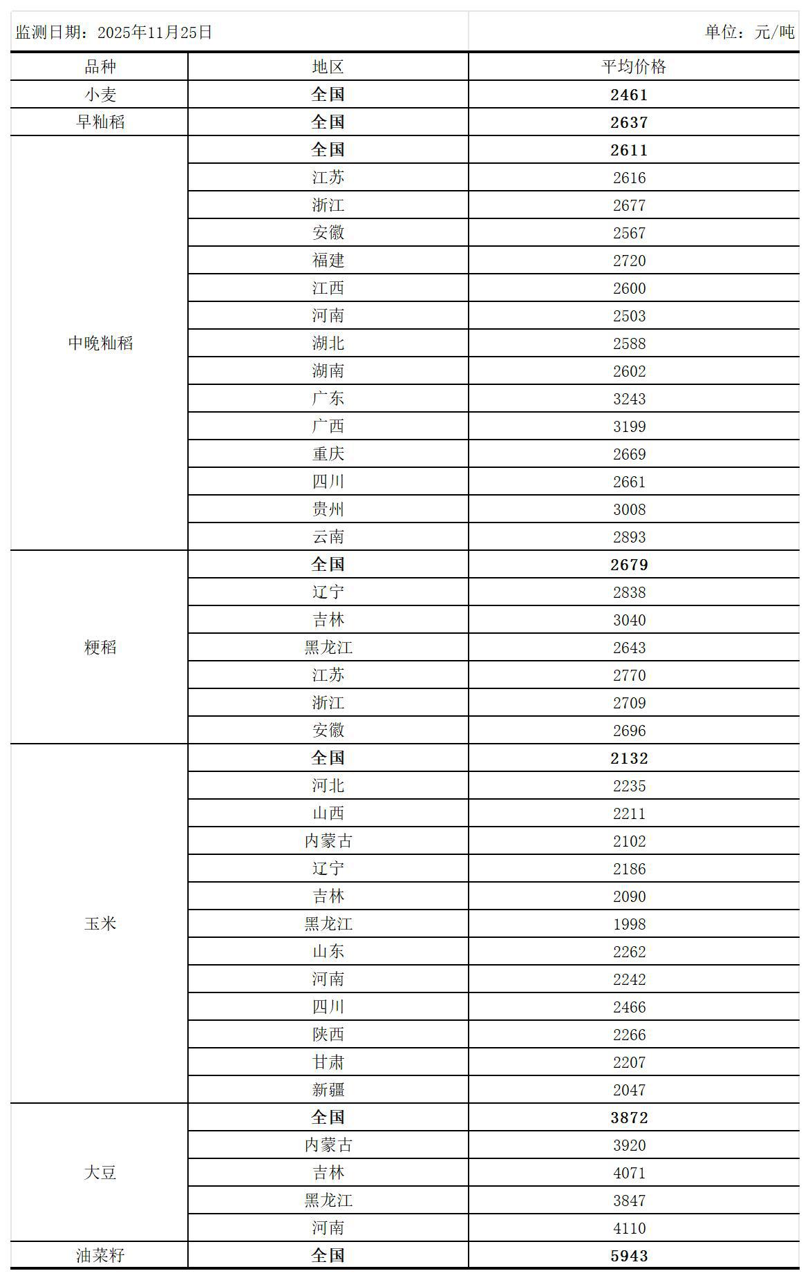 全国主要粮食品种收购价格周报(11月25日)