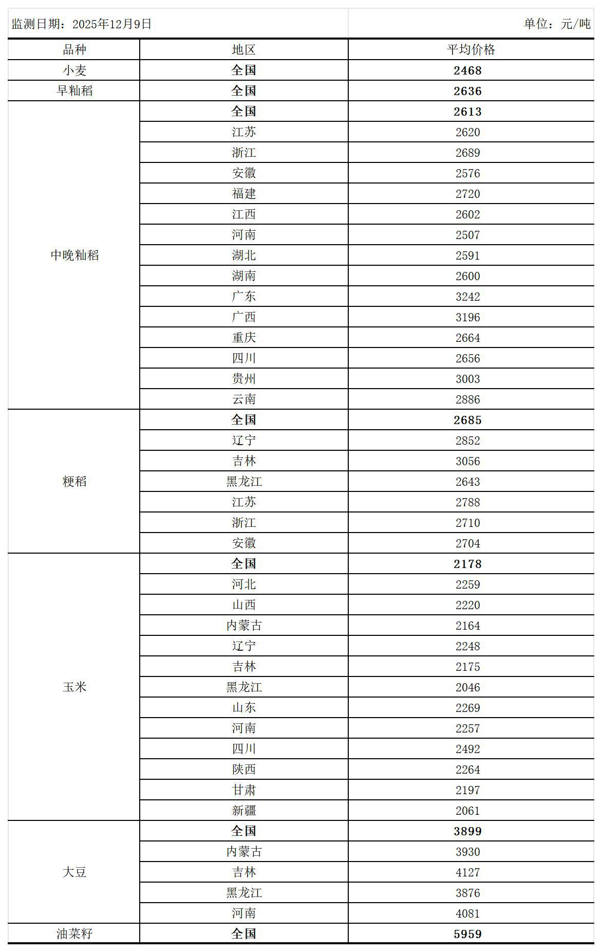 全国主要粮食品种收购价格周报(12月9日)