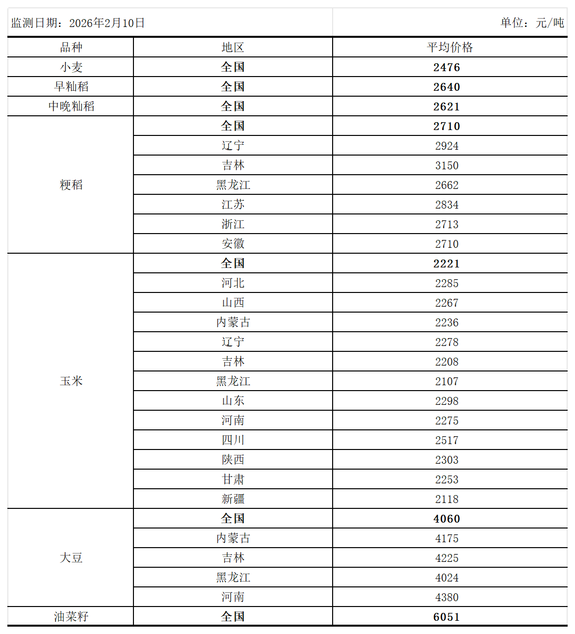 全国主要粮食品种收购价格周报(2月10日)