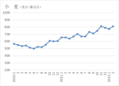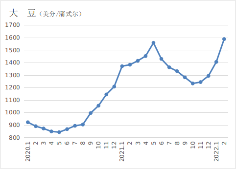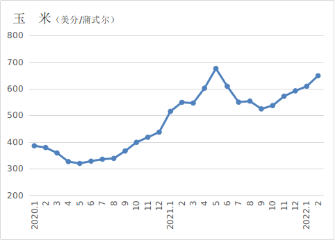 本月国际农产品价格大幅上涨,芝加哥交易所(CBOT)玉米、小麦、大豆期货月均价格分别为648.99美分/蒲式耳、808.82美分/蒲式耳、1587.66美分/蒲式耳,较上月分别上涨6.5%、4.8%、13.0%。