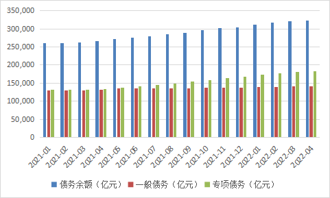 截至2022年4月末,全国地方政府债务余额322871亿元。其中,一般债务140942亿元,专项债务181929亿元。