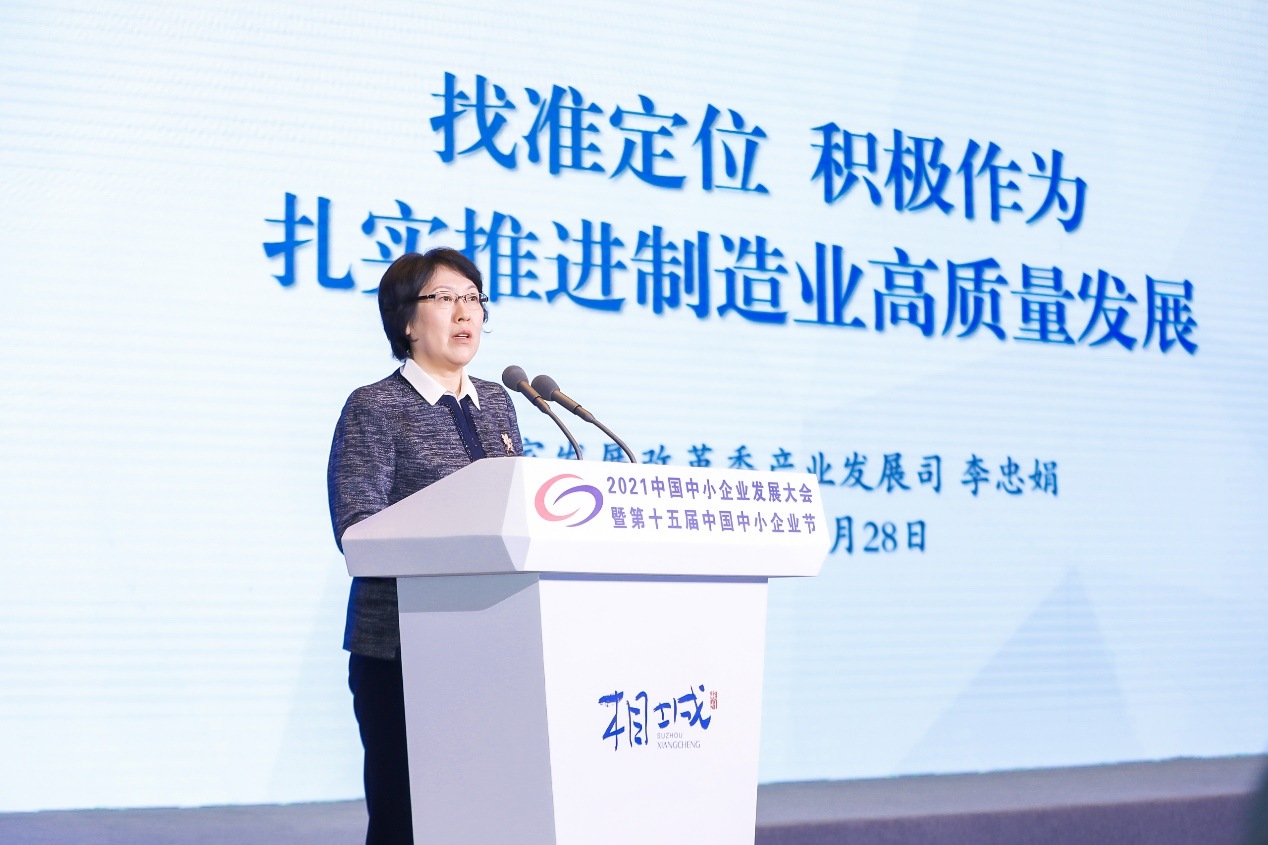 国家发展改革委产业发展司副司长、一级巡视员李忠娟同志参加开幕式,并发表了“找准定位 积极作为 扎实推进制造业高质量发展”的演讲。李忠娟同志指出,中小企业要胸怀“国之大者”,专注“专精特新”,聚焦实体经济,弘扬企业家精神,推动企业发展与国家发展同频共振,推动传统产业高端化、智能化、绿色化发展,为建设制造强国、加快构建新发展格局贡献力量。